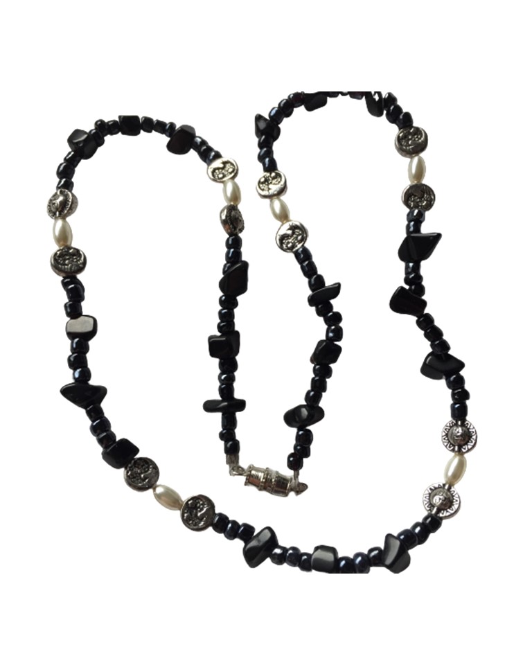 Published inHandcrafted Black Silver Sun Moon Beads with Oblong Pearls 19 Inch Necklace