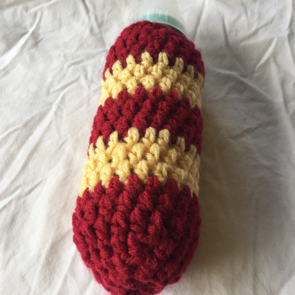 Burgundy and Peach Striped Crocheted Beer or Baby Bottle Holder 3×6. This hand crocheted beer or baby bottle sleeve was created using burgundy and light peach Red Heart medium weight yarn. The yarn is 100% acrylic, machine washable, machine dryable and hypoallergenic. It measures approximately 3-1/2 inches wide by 6 inches long. It is great for both baby bottles and beer bottles. Take some camping or even picnicking.