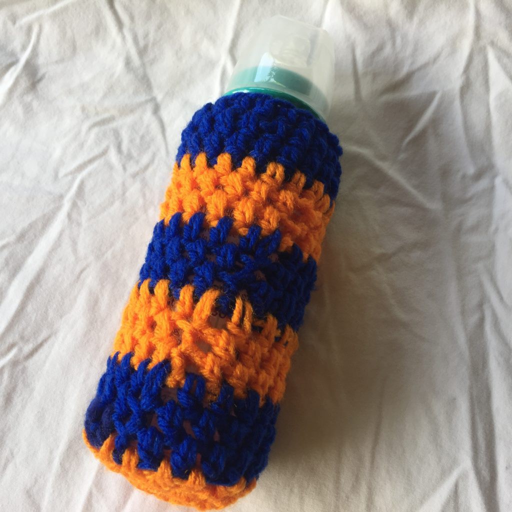 Hand Crocheted Dark Blue and Orange Striped Beer or Baby Bottle Holder 3×6