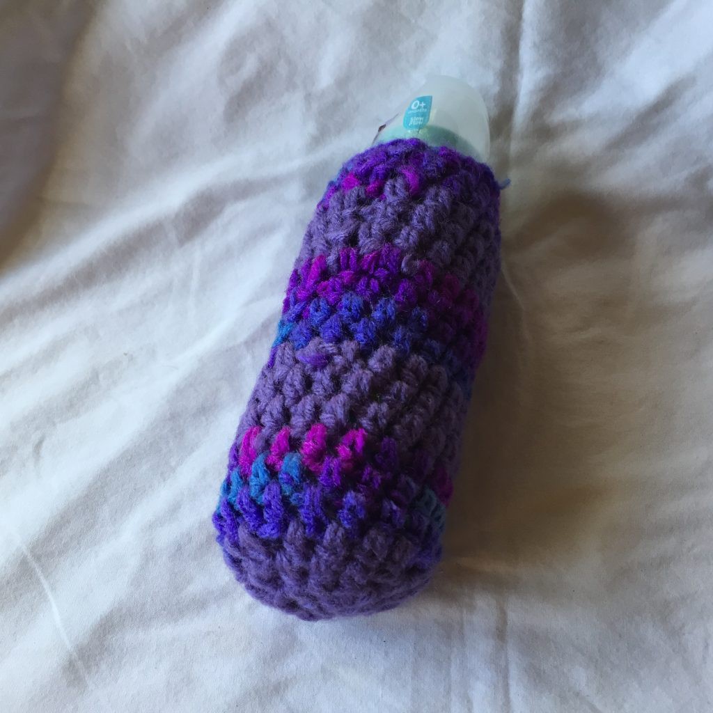 Dark Lavender and Variegated Purple Blue Striped Crocheted Beer or Baby Bottle Holder 3×6. This hand crocheted coozie was created using medium lavender and variegated purple blue and dark pink Red Heart medium weight yarn. The yarn is 100% acrylic, machine washable, machine dryable and hypoallergenic. It measures approximately 3-1/2 inches wide by 6 inches.