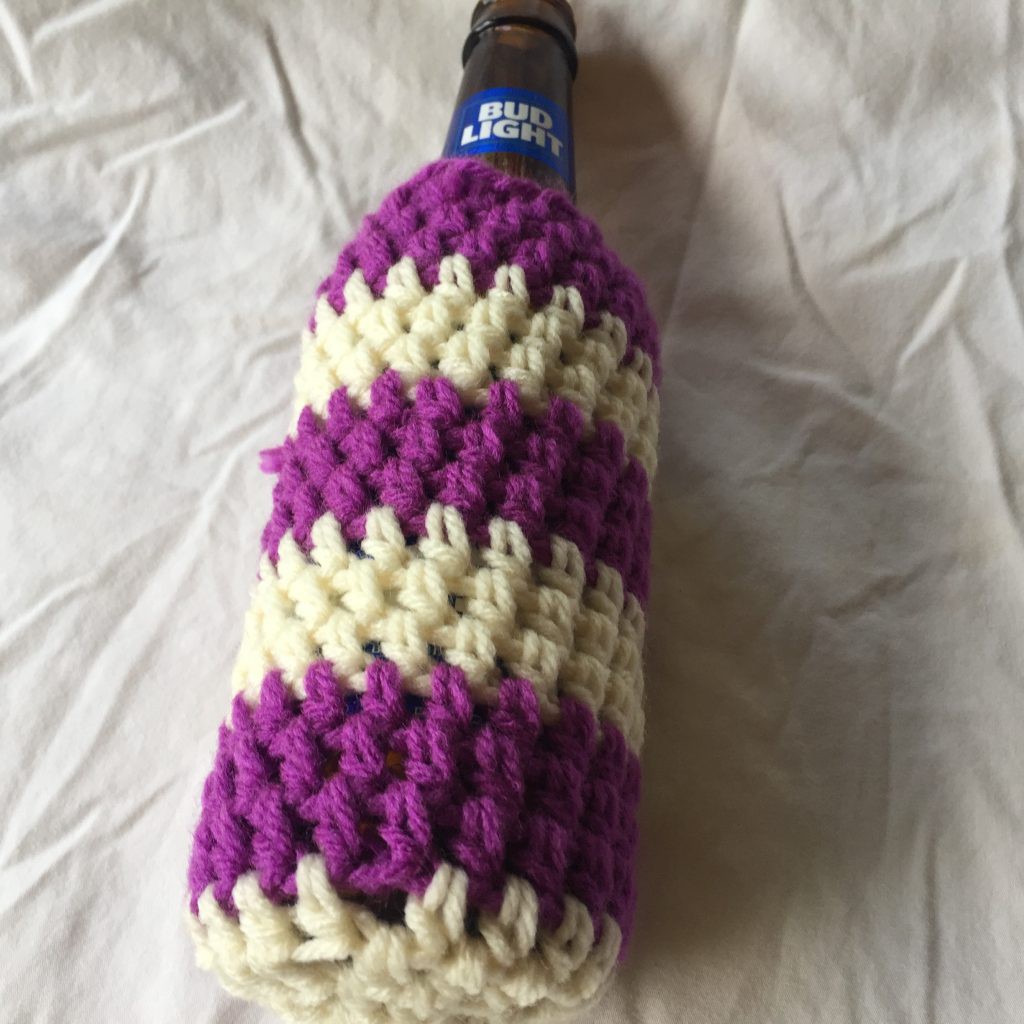 Hand Crocheted Purple and Cream Striped Beer or Baby Bottle Holder 3×6