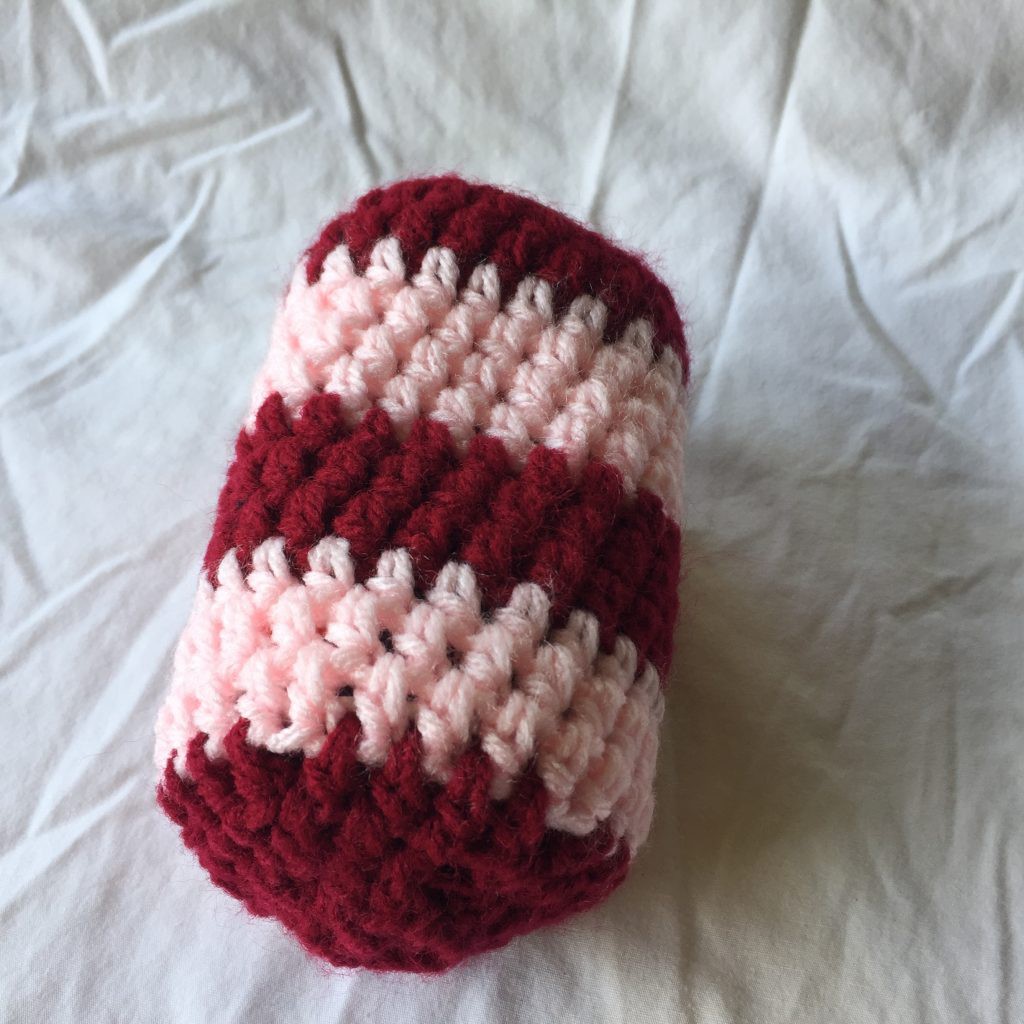 Burgundy and Light Pink Crocheted Drink Can Holder 4×5. This hand crocheted regular drink can holder was created using dark burgundy and light pink Red Heart medium weight yarn. The yarn is 100% acrylic, machine washable, machine dryable and hypoallergenic. It measures approximately 4 inches wide by 5 inches tall.
