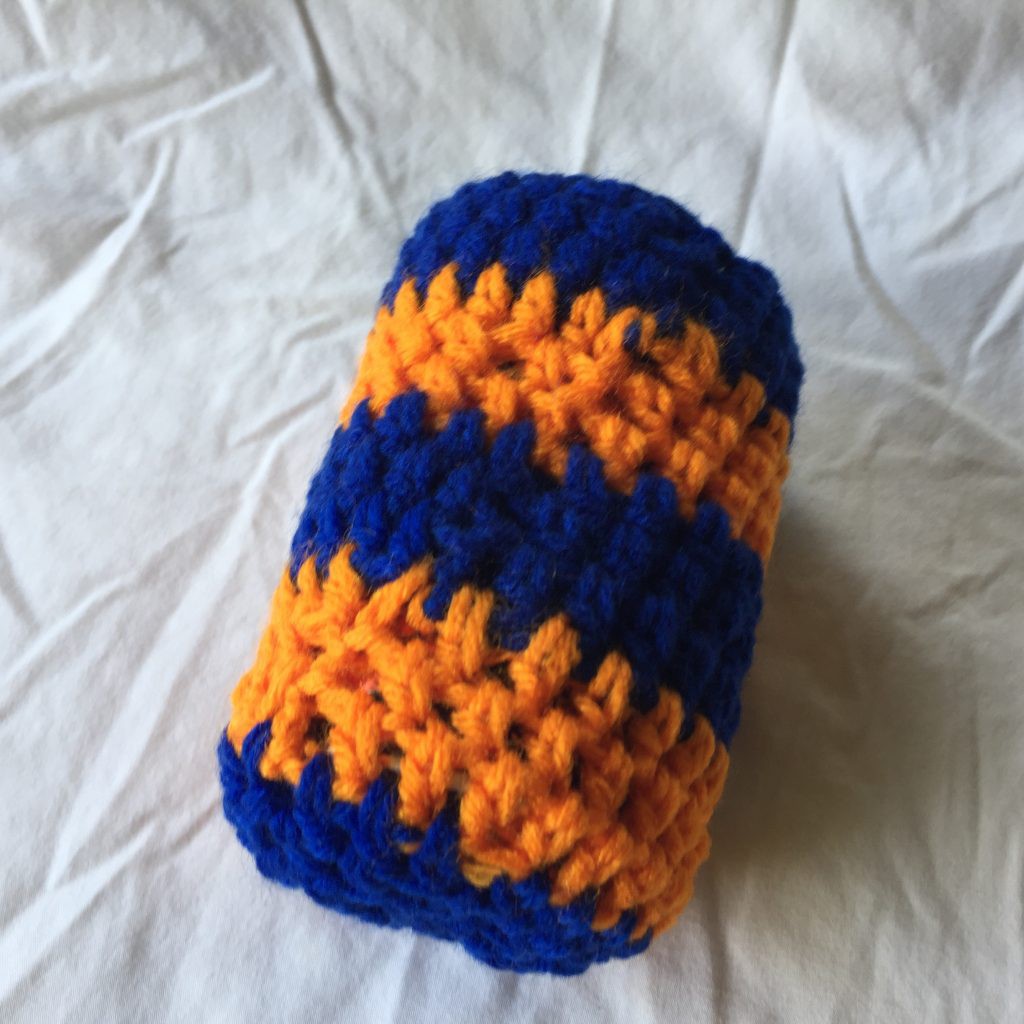 Dark Blue and Orange Striped Crocheted Drink Can Holder 4×5. This hand crocheted regular drink can coozie was created using dark blue and orange Red Heart medium weight yarn. The yarn is 100% acrylic, machine washable, machine dryable and hypoallergenic. It measures approximately 4 inches wide by 5-1/2 inches tall.