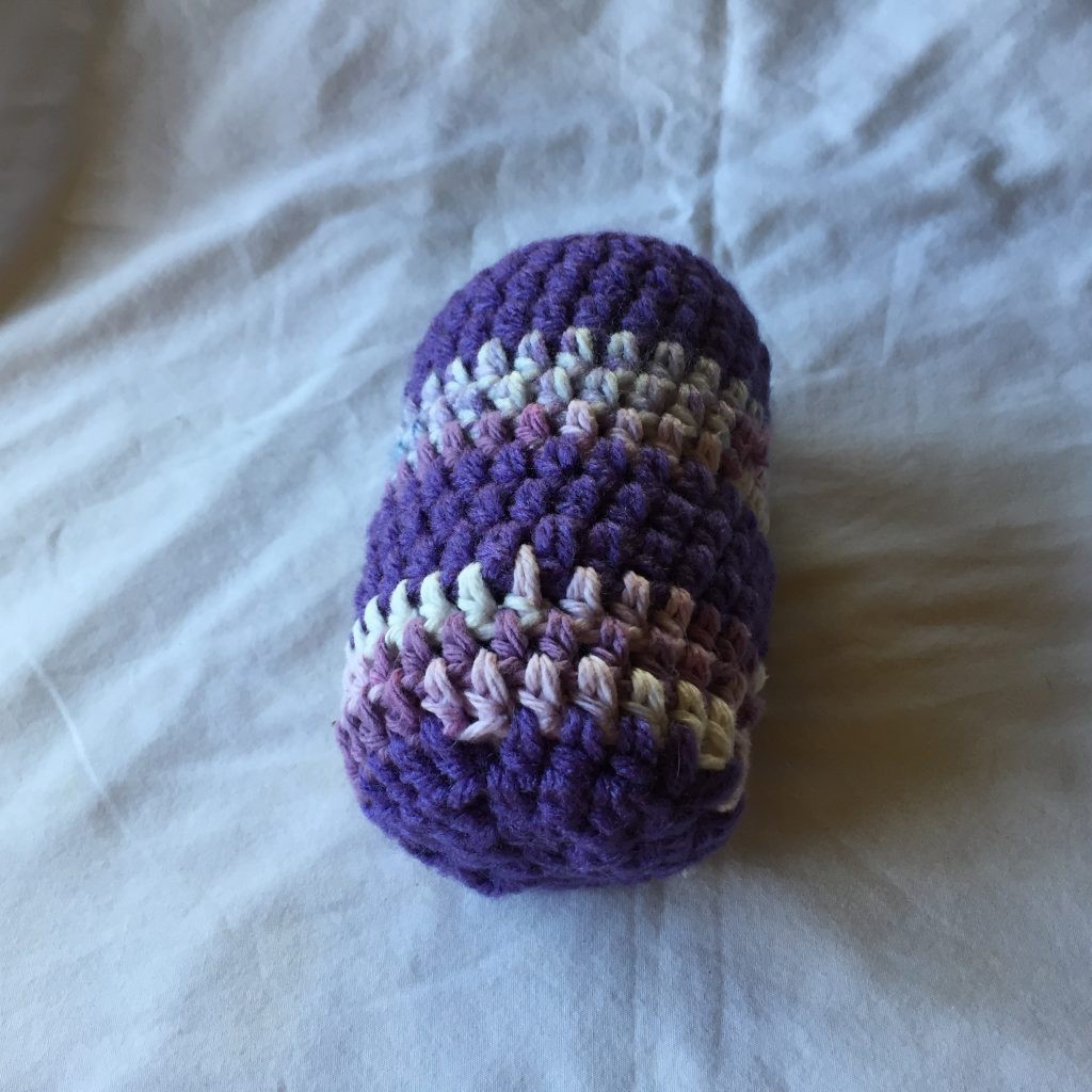 Dark Lavender and Variegated Lavender and White Striped Crocheted Regular Can Holder 4×5. This hand crocheted regular drink can coozie was created using dark lavender Red Heart medium weight 100% acrylic yarn and variegated purple and white 100% cotton yarn. The yarn is machine washable, dryable and hypoallergenic. It measures approximately 4 inches wide by 5-1/2 inches tall.