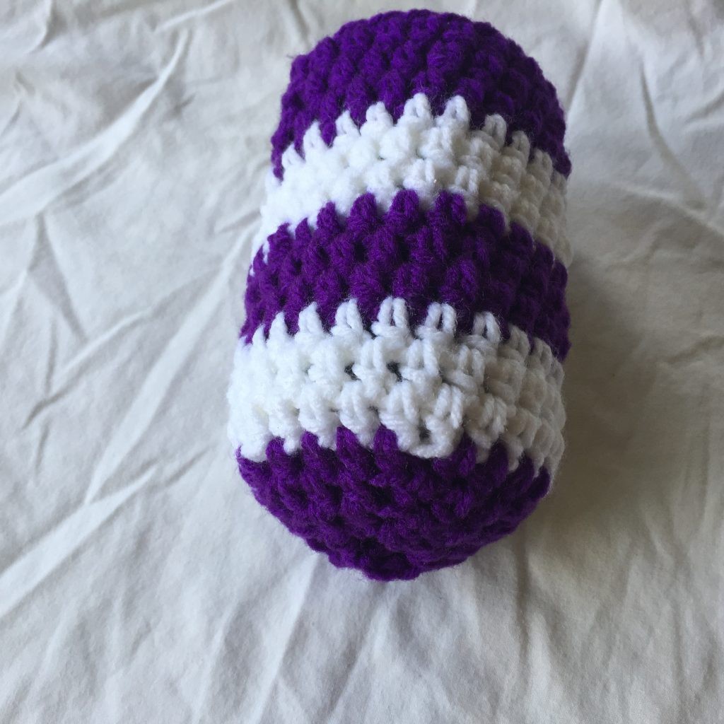 Dark Purple and White Striped Crocheted Drink Can Holder 4×5. This hand crocheted regular drink can coozie was created dark purple and bright white Red Heart medium weight yarn. The yarn is 100% acrylic, machine washable, machine dryable and hypoallergenic. It measures approximately 4 inches wide by 5-1/2 inches tall.