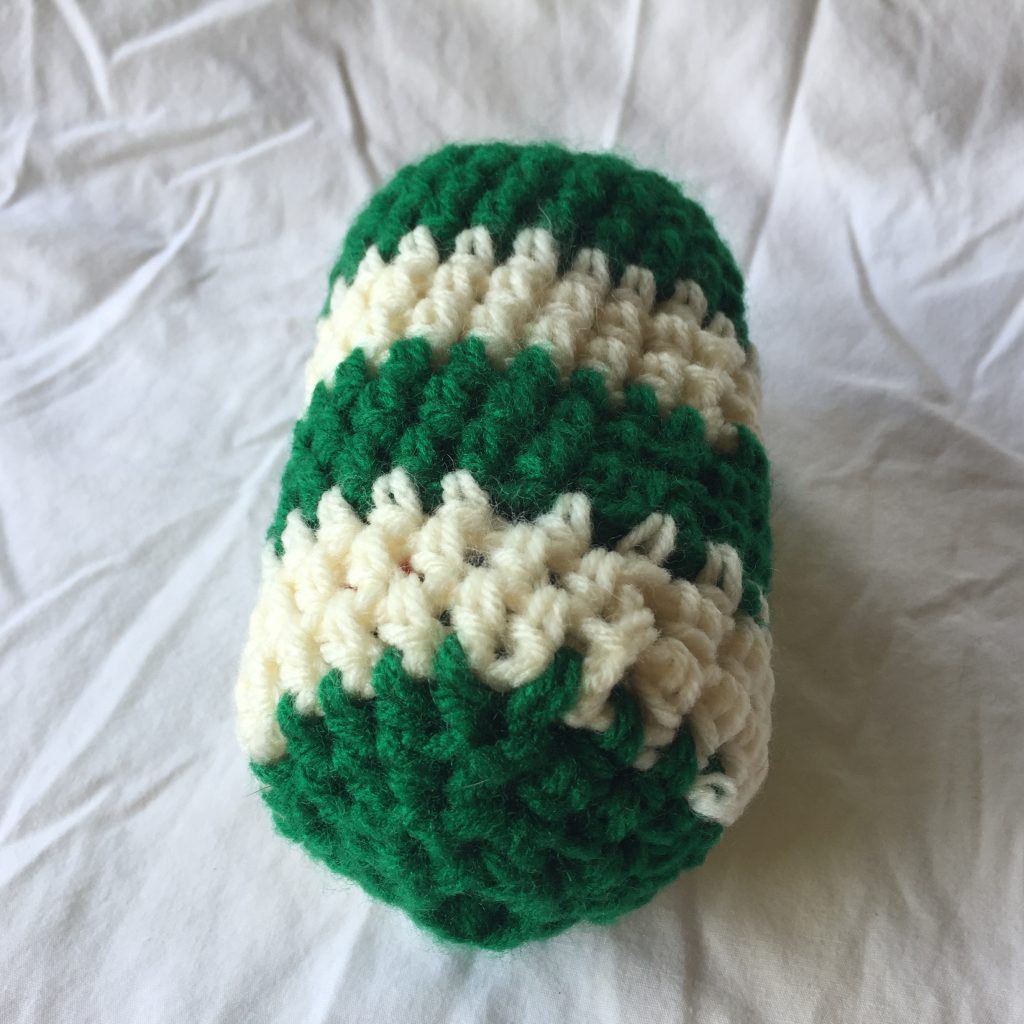 Kelly Green and White Striped Crocheted Drink Can Holder 4×5. This hand crocheted regular drink can coozie was created using dark kelly green and creamy beige Red Heart medium weight yarn. The yarn is 100% acrylic, machine washable, machine dryable and hypoallergenic. It measures approximately 4-1/2 inches wide by 5-1/2 inches tall.