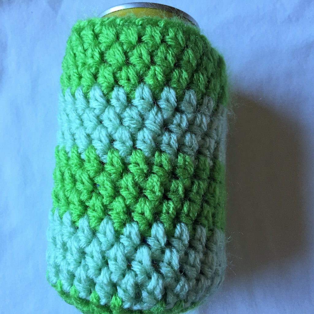 Medium and Light Sage Green Striped Crocheted Can Coozie 4×5. This hand crocheted regular drink can holder was created using medium sage green and light sage green Red Heart medium weight yarn. The yarn is 100% acrylic, machine washable, machine dryable and hypoallergenic. The bag measures approximately 4 inches wide by 5 inches tall.
