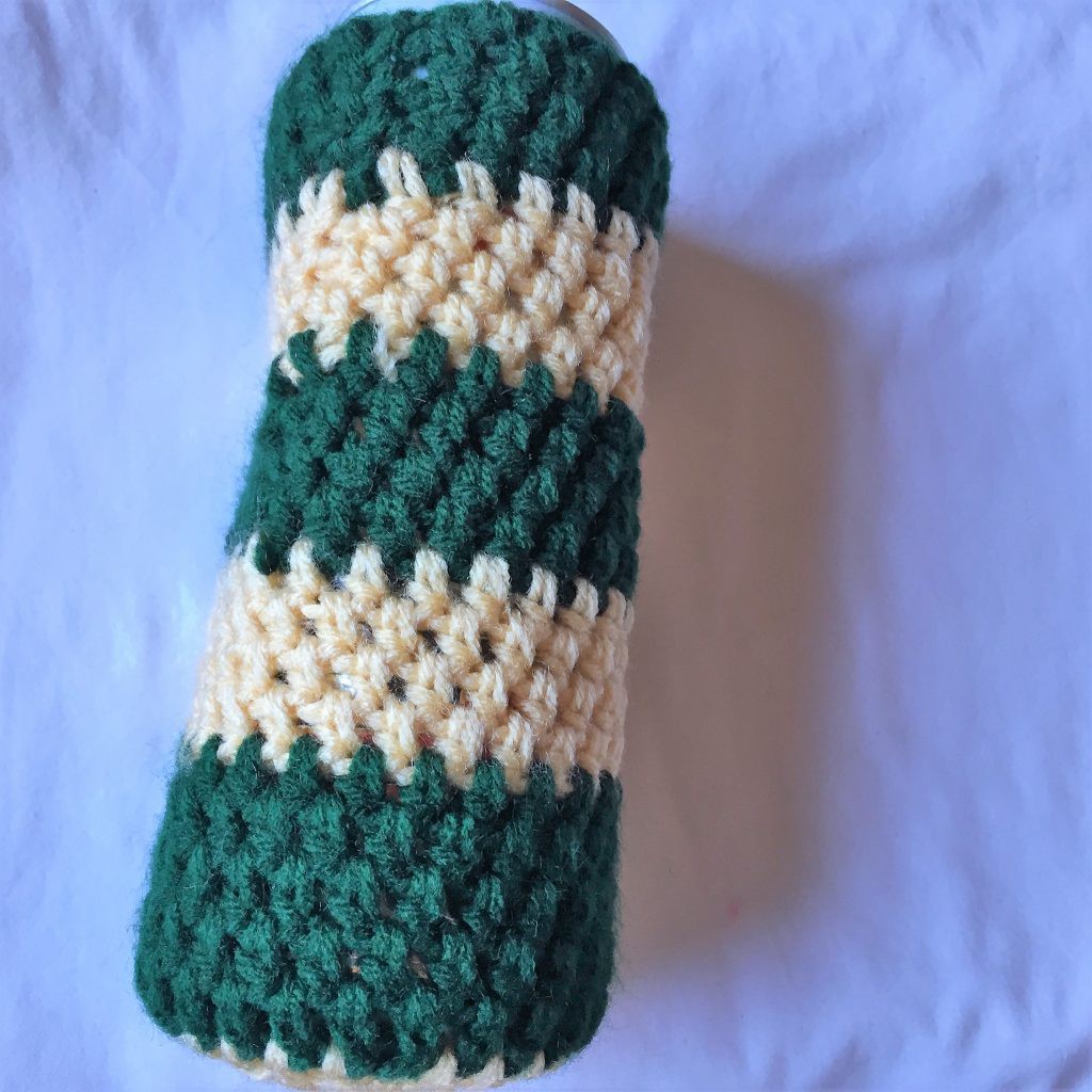 Dark Green and Peach Striped Crocheted Tall Can Coozie 4×8. This hand crocheted tall drink can holder was created using dark green and peachy Red Heart medium weight yarn. It measures approximately 4 inches wide by 8 inches tall. The yarn is 100% acrylic, machine washable, machine dryable and hypoallergenic.