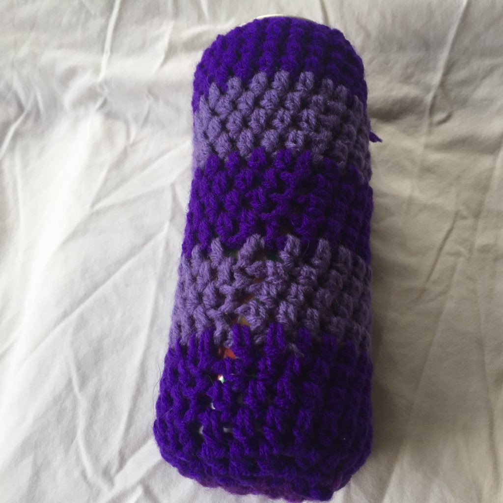 Dark Purple and Lavender Crocheted Tall Can Drink Holder 4×8. This handcrafted bag was created using dark purple and medium purple Red Heart medium weight yarn. It measures approximately 4 inches wide by 8 inches tall. The yarn is 100% acrylic, machine washable, machine dryable and hypoallergenic.