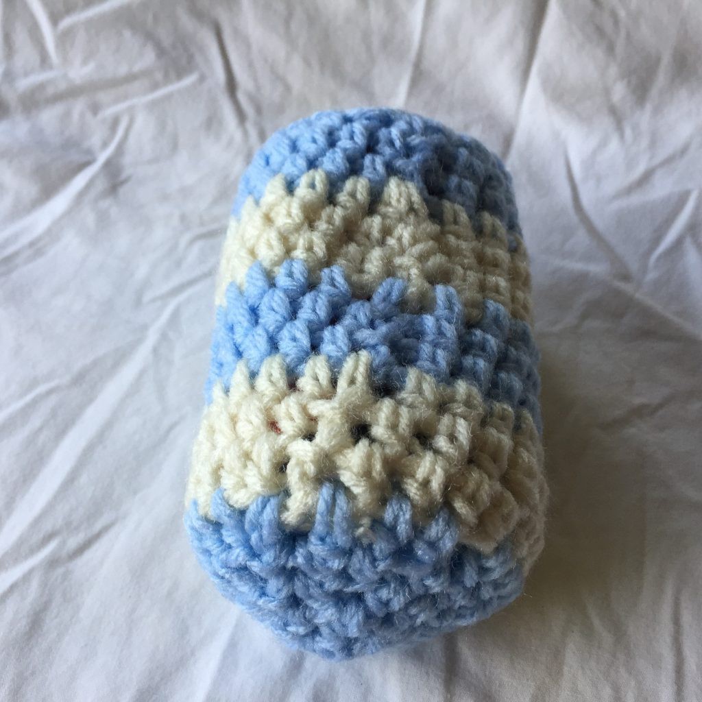 Light Blue and White Striped Crocheted Drink Can Holder 4×7. This hand crocheted regular drink can holder was created using light blue Red and creamy beige Red Heart medium weight yarn. The yarn is 100% acrylic, machine washable, machine dryable and hypoallergenic. It measures approximately 4 inches wide by 7 inches tall.