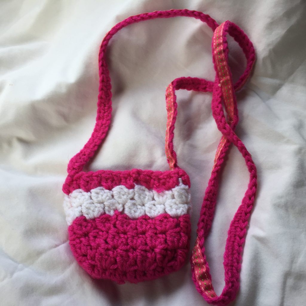 Hand Crocheted Dark Pink and White 4×5 Crocheted Cellphone Bag. This hand crocheted bag was created using dark pink and white Red Heart medium weight yarn. The hand crocheted strap is dark pink and is 46 inches long. The bag is 4 inches tall by 5 inches wide. We have hand stitched a raspberry limeade cotton twill ribbon to the underside of the strap to help keep the bag from sagging while in use as well as a white satin like lining into the center of the tote. The yarn is 100% acrylic, machine washable, machine dryable and hypoallergenic.