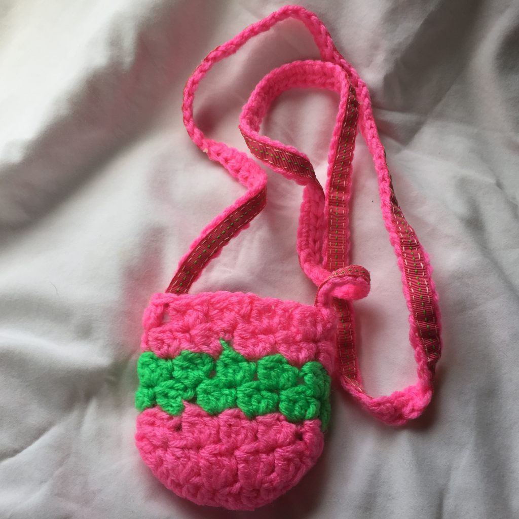 Hot Pink and Green 4×4 Crocheted Cellphone Tote with White Lining. This hand crocheted bag was created using Red Heart medium weight yarn in hot pink and neon green. The bag measures approximately 4 inches wide by 4 inches tall. The hand crocheted strap is about 44 inches long. We have also hand stitched a raspberry limeade cotton twill ribbon on the underside of the strap to help keep the bag from sagging while in use as well as a white satin like lining inside the bag. The yarn is 100% acrylic, machine washable, dryable and hypoallergenic.