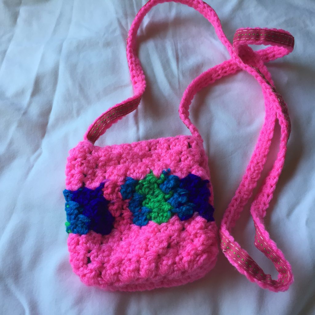 Hand Crocheted Hot Pink and Variegated Jewel Crocheted 5×5 Cellphone Bag with Black Lining. The tote was hand crocheted using hot pink and variegated jewel toned colored medium weight yarn. The bag measures approximately 5 inches wide by 5 inches tall and has a solid pink crocheted separator panel inside the bag. The handle was hand crocheted using the hot pink yarn and is about 50 inches long. We have hand stitched a raspberry limeade cotton twill ribbon to the underside of the strap to help keep the tote from sagging while in use as well as a black satin like lining inside the bag. The yarn is 100% acrylic, machine washable, machine dryable and hypoallergenic.