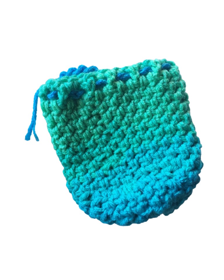 Hand Crocheted Cool Striped Drawstring 4 X Coin Bag. This ditty bag using Red Heart yarn called Cool Stripe in variegated colors lime green, teal blue and medium green. The bag measures approximately 4-1/2 inch by 4 inches with hand crocheted teal blue drawstring woven around the top to help open and close the bag. The yarn is 100% acrylic, machine washable, machine dryable and hypoallergenic.