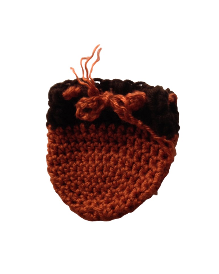 Hand Crocheted Pumpkin and Brown 5×4 Coin Bag. This bag was created using Caron Simply Soft yarn in pumpkin orange and dark brown that is 100% acrylic, hypoallergenic, machine washable and machine dryable. It measures approximately 5 inches tall by 4 inches wide and has a crocheted drawstring in orange.