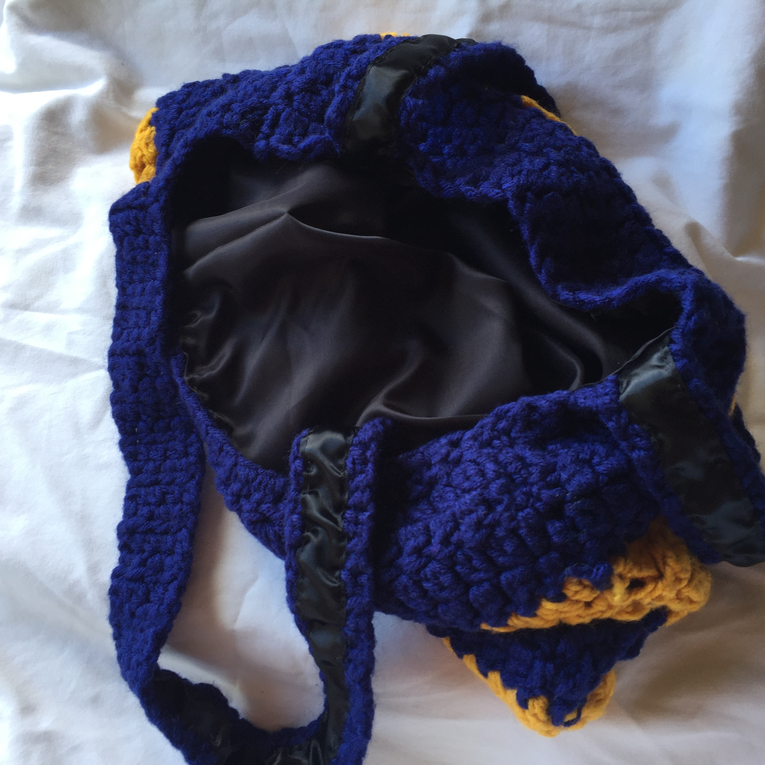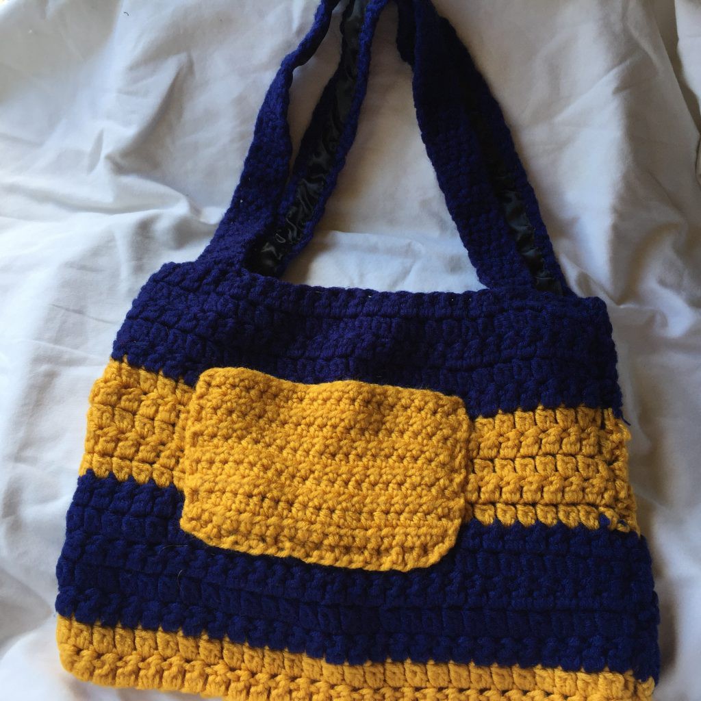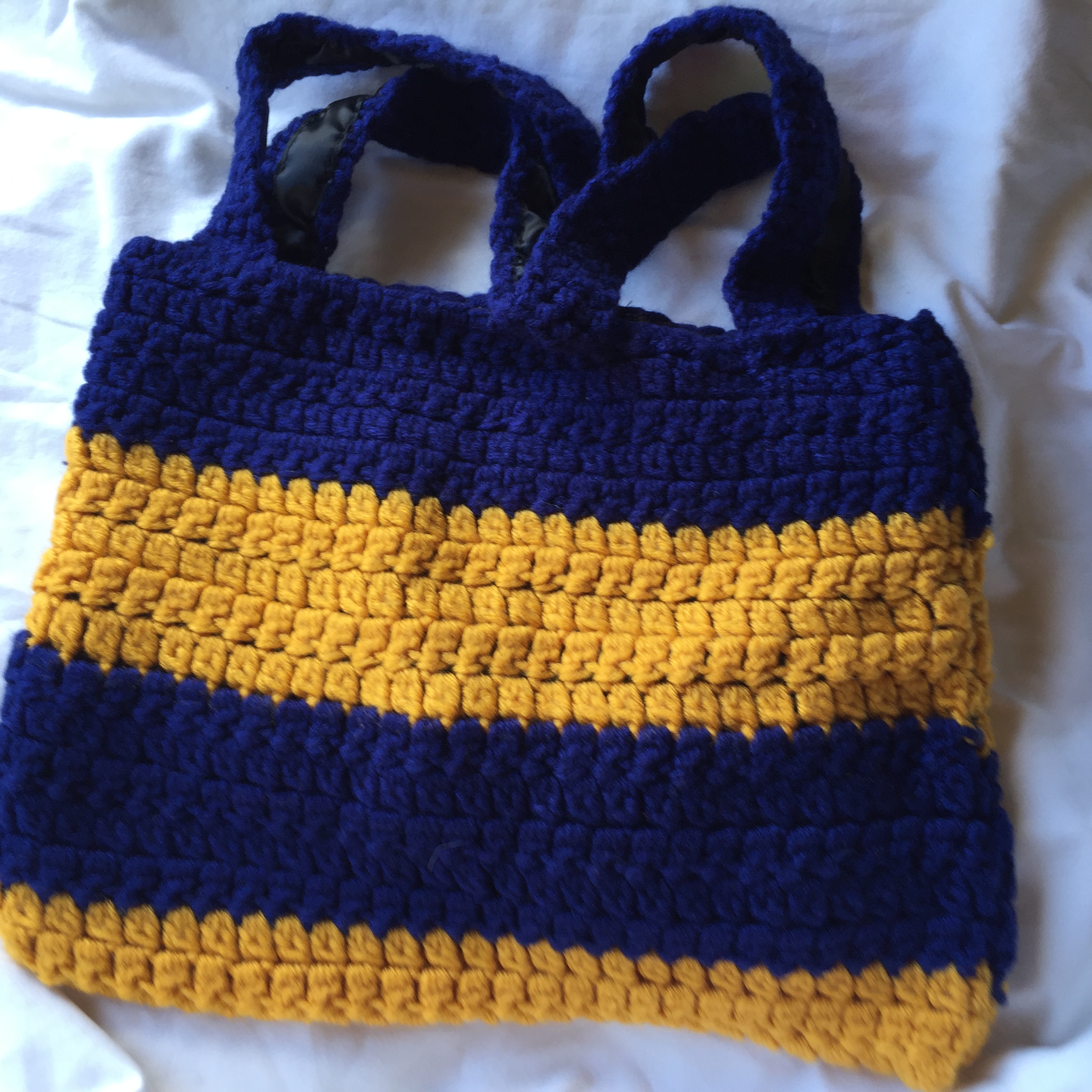 Gold and Dark Blue 14×12 Crocheted Tote with Black Lining. This hand crocheted bag was created using dark blue and gold Red Heart medium weight yarn that is machine washable, dryable and 100% acrylic. The purse measures approximately 12 inches tall by 14 inches wide with a hand stitched black satin like lining on the inside and hand crocheted gold pocket on the outside. It comes with a dark blue 1-1/2 inch by 23 inches long set of crocheted straps that we have hand stitched a black satin ribbon to the underside of each of the straps.