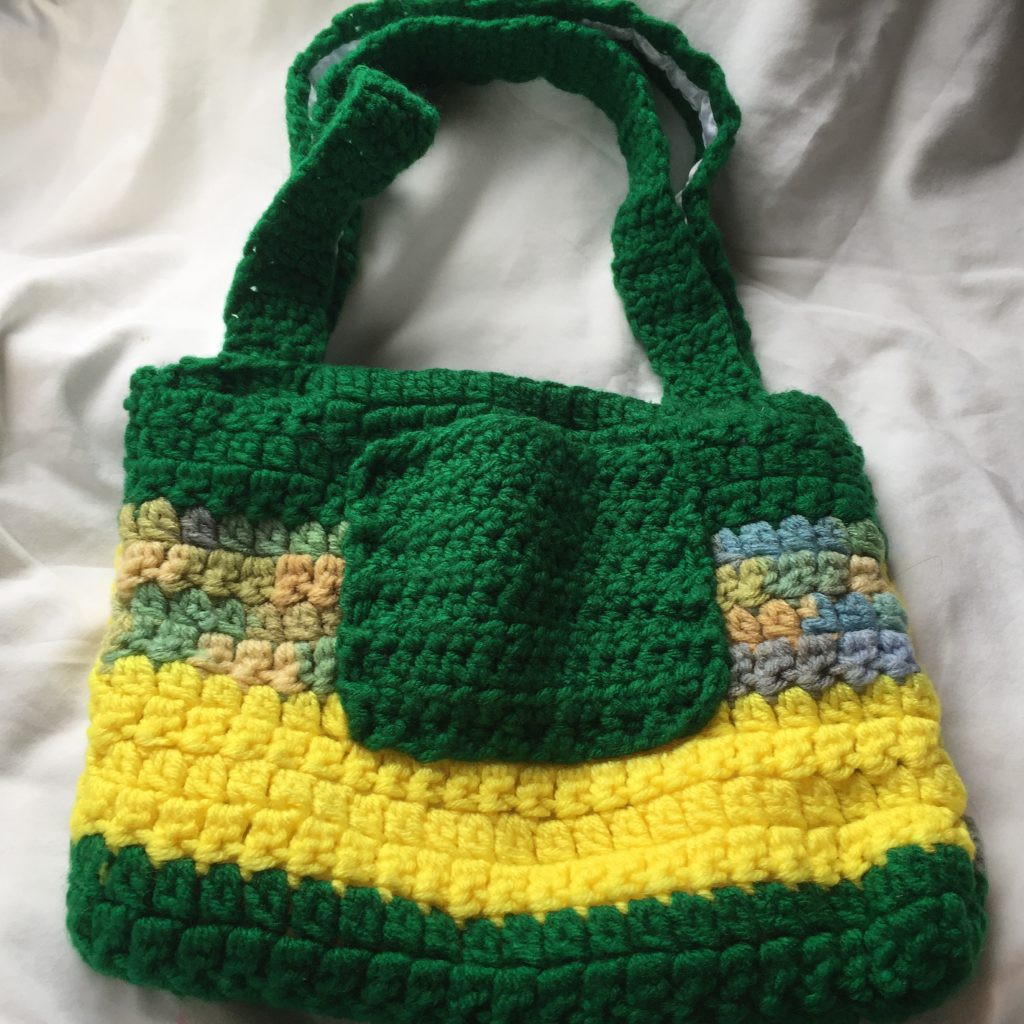 Kelly Green and Yellow with Variegated Blue Green Yellow Striped Crocheted 11×10 Tote With White Lining. This hand crocheted purse was created using machine washable, machine dryable and hypoallergenic sports yarn. It has alternating stripes of solid green, solid yellow and variegated Easter colors with a Kelly green crocheted pocket in the front and solid green crocheted straps. It approximately measures 11 inches wide by 10 inches tall and the straps are about 24 inches long. We have hand stitched a white satin ribbon onto the underside of the straps so that the bag will not sag while in use as well as a white satin like lining inside the tote.