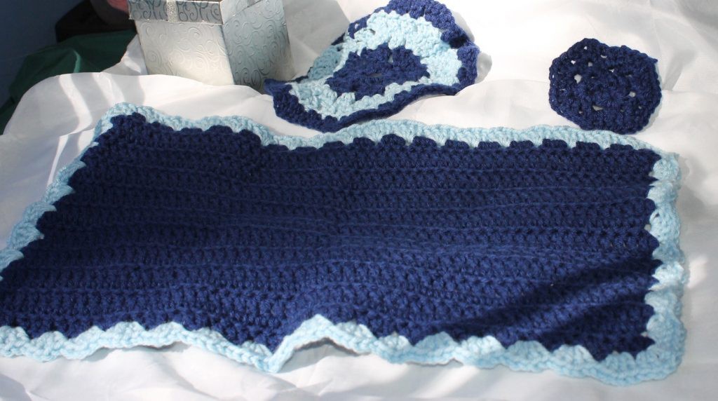 Dark and Light Blue Couples Table Settings. The set was hand crocheted using 100% acrylic Red Heart medium weight yarn in dark and light blue. The set includes 2 placemats, 2 coasters, and a potholder. The placemats measure approximately 19-1/2 by 12 inches. The coasters are about 3-1/2 inches around and the potholder is approximately 8 inches across and round. The yarn is machine washable, machine dryable and hypoallergenic.