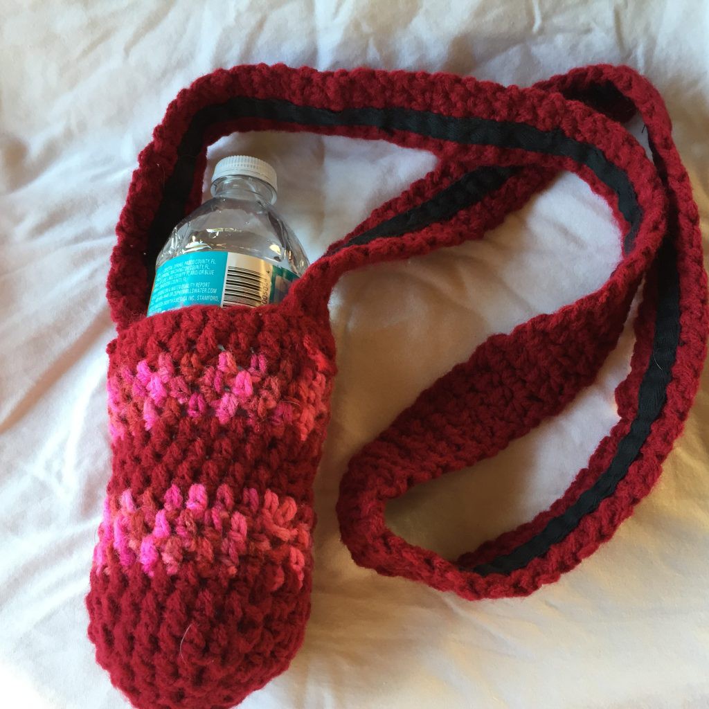 Burgundy and Variegated Pink Burgundy Crocheted 4×6 Water Bottle Holder. This hand crocheted bag was created using burgundy and variegated pink and burgundy Red Heart yarn The tote measures approximately 4 inches wide by 6 inches tall with crocheted 44-inch strap with black cotton twill ribbon hand sewn into the underside of the strap as well along the insides of the bag. This should keep it from stretching while in use. The yarn is 100% acrylic, machine washable, dryable and hypoallergenic.