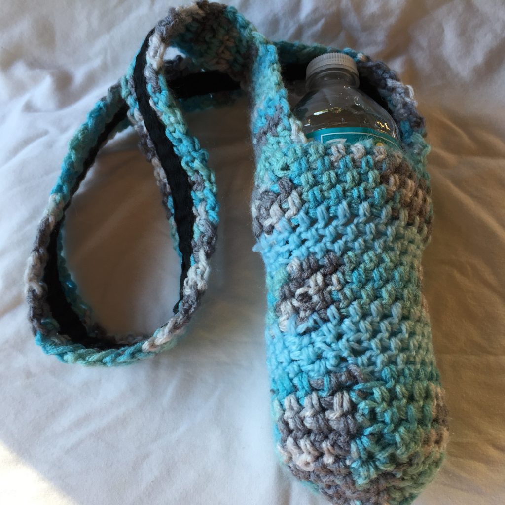 Variegated Turquoise Gray and White Crocheted 4×7 Water Bottle Holder. This hand crocheted bag was created using variegated turquoise blue gray and white Red Heart yarn. The tote measures approximately 4 inches wide by 7 inches tall with a crocheted 30-inch strap that has black cotton twill ribbon hand sewn into the inside of the strap and along the sides of the bag. This should help keep the tote from stretching while in use. The yarn is 100% acrylic, machine washable, dryable, and hypoallergenic.