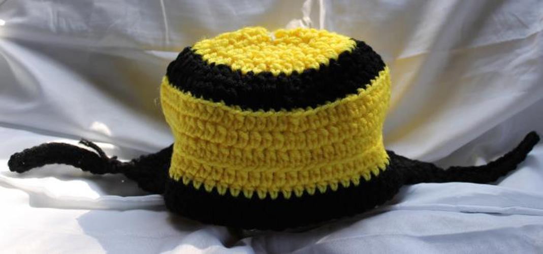 Black and Yellow 6×21 Inch Crocheted Hat with Flaps. This hand crocheted beanie hat was created using Red Heart medium weight yarn in lemon yellow and black. It measures approximately 21 inches around and 6-1/2 inches tall with 6 inch crocheted flaps on the sides. The yarn is 100% acrylic, machine washable, machine dryable and hypoallergenic.