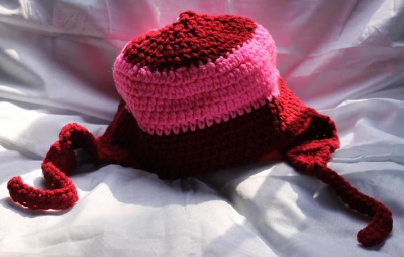Burgundy and Hot Pink Striped 6×21 Inch Hat with Flaps. This hand crocheted hat was created using Red Heart medium weight yarn in hot pink and dark burgundy. It measures 21 inches around 6 inches tall and the side crocheted flaps are 10 inches long. The yarn is 100% acrylic, machine washable, machine dryable and hypoallergenic.