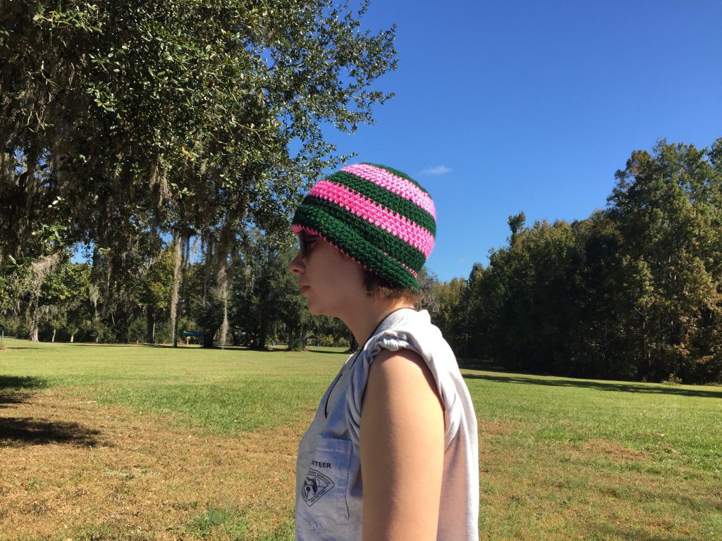Dark Green and Hot Pink Striped 9×20 Crocheted Hat. Hand crocheted using regular Red Heart medium weight yarn in alternating colors of dark green and hot pink. The yarn is 100% acrylic, machine washable, machine dryable and hypoallergenic. The hat measures 9 inches from the top to the bottom and 20 inches around the bottom.
