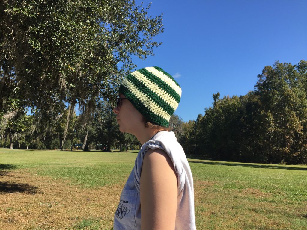 Dark Green and Light Yellow Striped 8×22 Crocheted Hat. Hand crocheted using regular Red Heart medium weight yarn in dark green and light yellow that is 100% acrylic, machine washable, machine dryable and hypoallergenic. The hat measures approximately 8 inches from the top to the bottom and 22 inches around the bottom.
