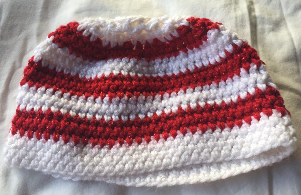 Dark Red and White Striped Sparkles Crocheted Brioche Style 7×20 Inch Hat. This hand crocheted beanie hat was created using Red Heart Love soft yarn in white and sparkling dark red. The yarn is 100% acrylic, machine washable, dryable and hypoallergenic. It measures approximately 7 inches tall by 20 inches around.