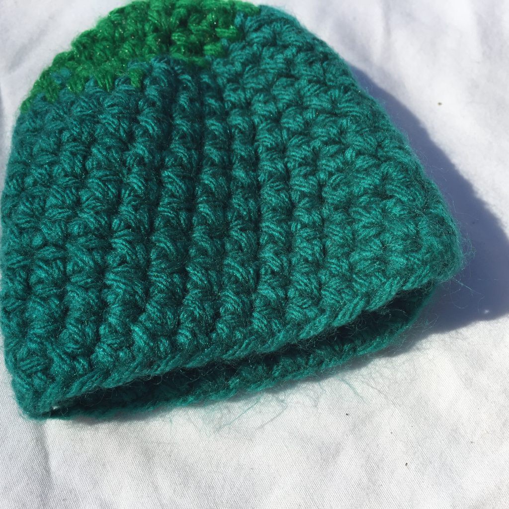 Green and Blue Striped 4×8 Newborn Baby Doll Crocheted Cap. This hand crocheted cap was created using Red Heart medium weight yarn in green and teal blue. The hat measures approximately 4 inches tall by 8 inches around the bottom. The yarn is 100% acrylic, machine washable, machine dryable and hypoallergenic.