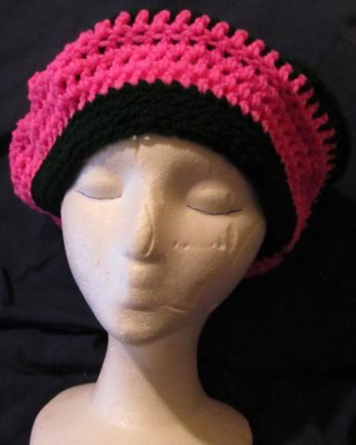 Hand Crocheted Hot Pink Dark Green 10×22 Inch Beret Style Hat