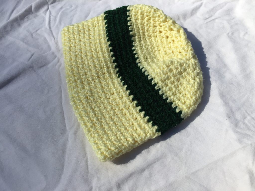 Light Yellow with Dark Green Striped 7×17 Crocheted Hat. Hand crocheted regular being hat in light yellow and dark green regular weight yarn that is 100% acrylic, machine washable, machine dryable and hypoallergenic. The hat measures approximately 7 inches from the top to bottom and 17 inches around the bottom.