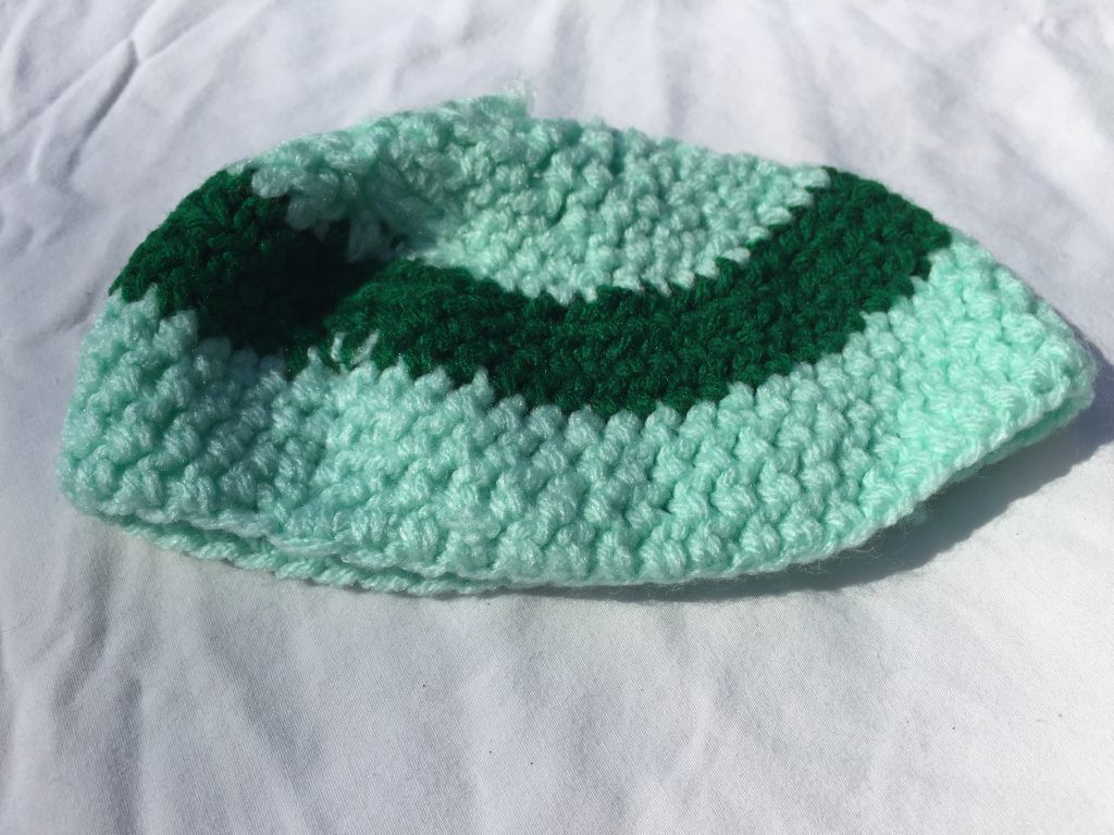 This hand crocheted cap was created using Red Heart medium weight yarn in light green and dark green stripes. The hat measures approximately 4 inches tall and 14 inches around the bottom.