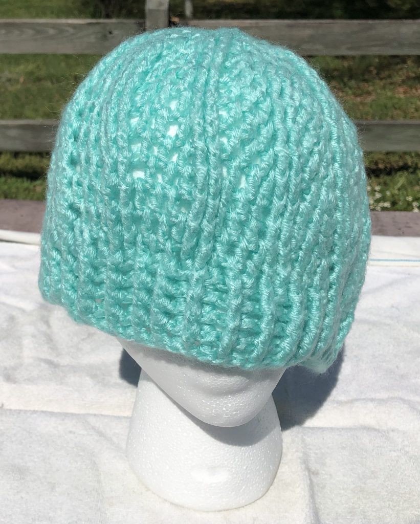 Mint Green 24 Inch Around 8 Inch Tall Twill Crocheted Hat. This hand crocheted beanie cap was created using light green regular yarn. The hat measures approximately 24 inches around by 8 inches tall. The yarn is machine washable, dryable and hypoallergenic.