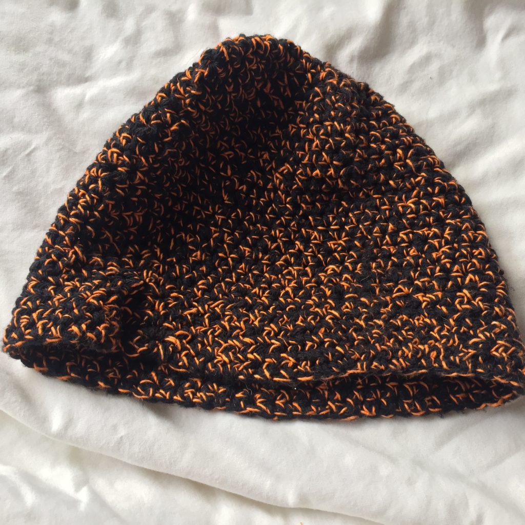 Neon Black and Orange 8×10 Inch Beanie Hat. This hand crocheted cap was created using a variegated mixture of black and neon orange regular Peaches and Cream cotton yarn. The hat measures approximately 8 inches from top to bottom and 20 inches around the bottom. The yarn is 100 % cotton, machine washable, machine dryable and hypoallergenic.