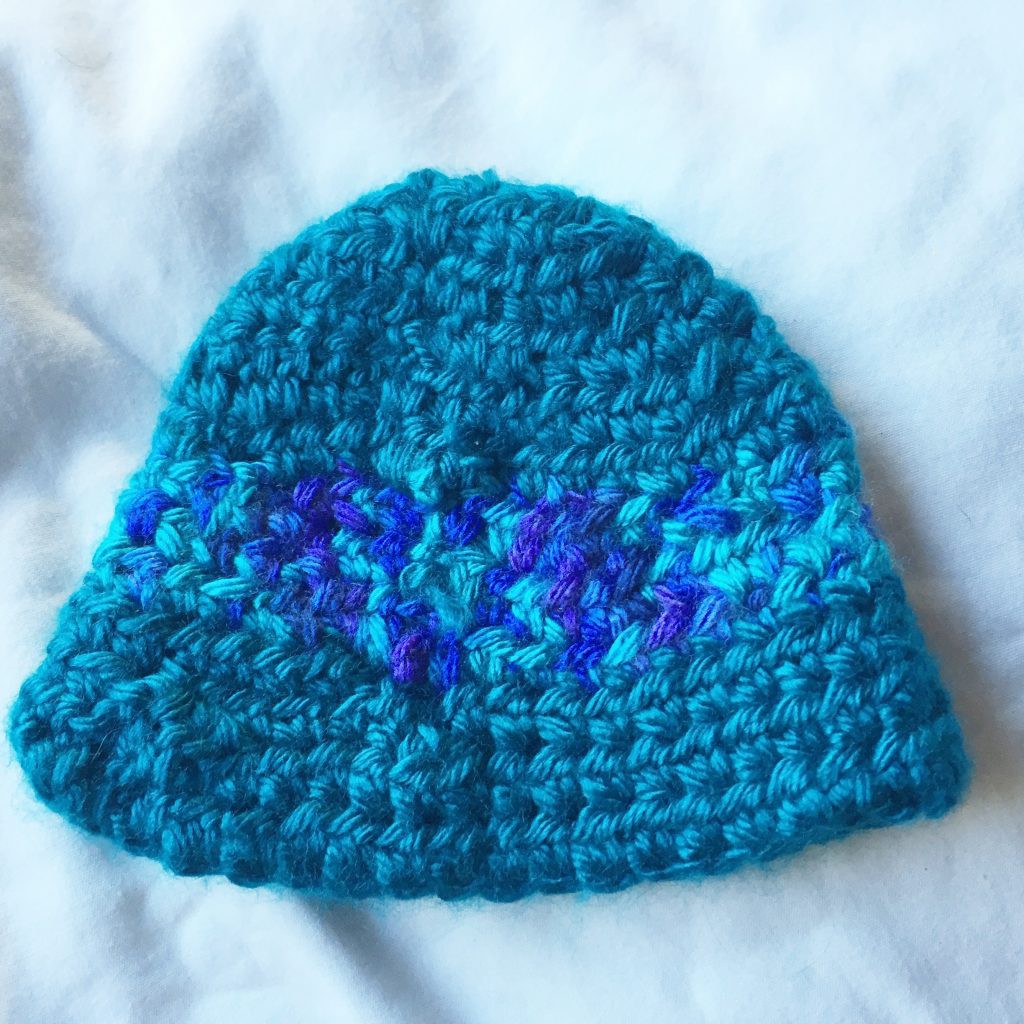 Ocean and Oceania Striped 4×10 Inch Preemie Baby Hat. This hand crocheted using Caron Simply Soft yarn in solid dark teal and variegated teal, purple and blue. The hat measures approximately 10 inches around the bottom and 4 inches from top to bottom. The yarn is 100% acrylic, machine washable, machine dryable and hypoallergenic.