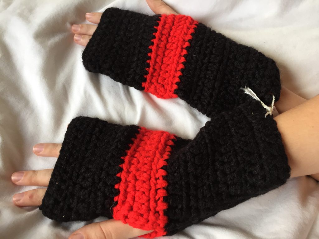 Black and Dark Red Wrist Warmers 9×4. These hand crocheted fingerless gloves were created using Red Heart medium weight yarn in red and black. They measure approximately 9-1/2 inches long by 4 inches wide. The yarn is 100% acrylic, hypoallergenic, machine washable and machine dryable.