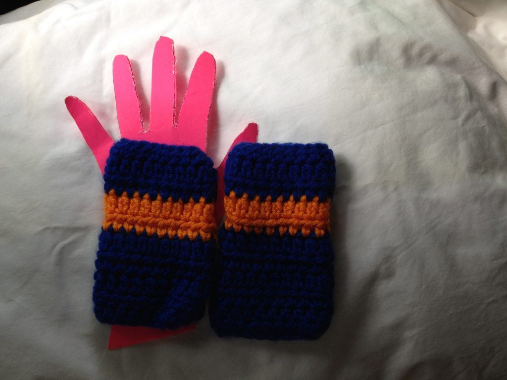 This hand crocheted fingerless glove set was created using Red Heart medium weight yarn in dark blue and orange. The pair measures approximately 5 inches long by 3-1/2 inches wide.