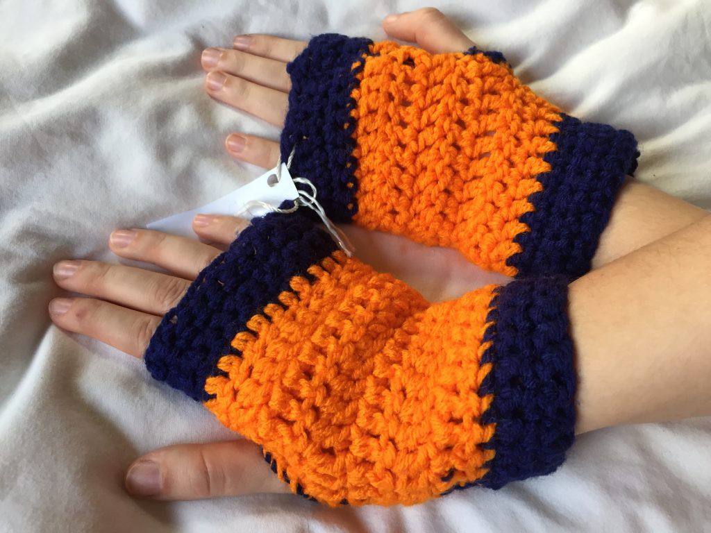 These hand crocheted fingerless gloves were created using Red Heart medium weight yarn in dark blue and orange. They measure approximately 7 inches long by 3-1/2 inches wide.