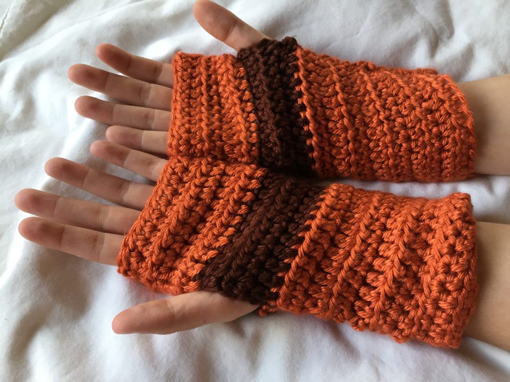 Pumpkin and Brown Wrist Warmers 8×4. These hand crocheted fingerless gloves were created using Caron Simply Soft yarn in pumpkin orange and dark brown. The yarn is 100% acrylic, hypoallergenic, machine washable and machine dryable. They measure approximately 8-1/2 inches long by 4 inches wide.