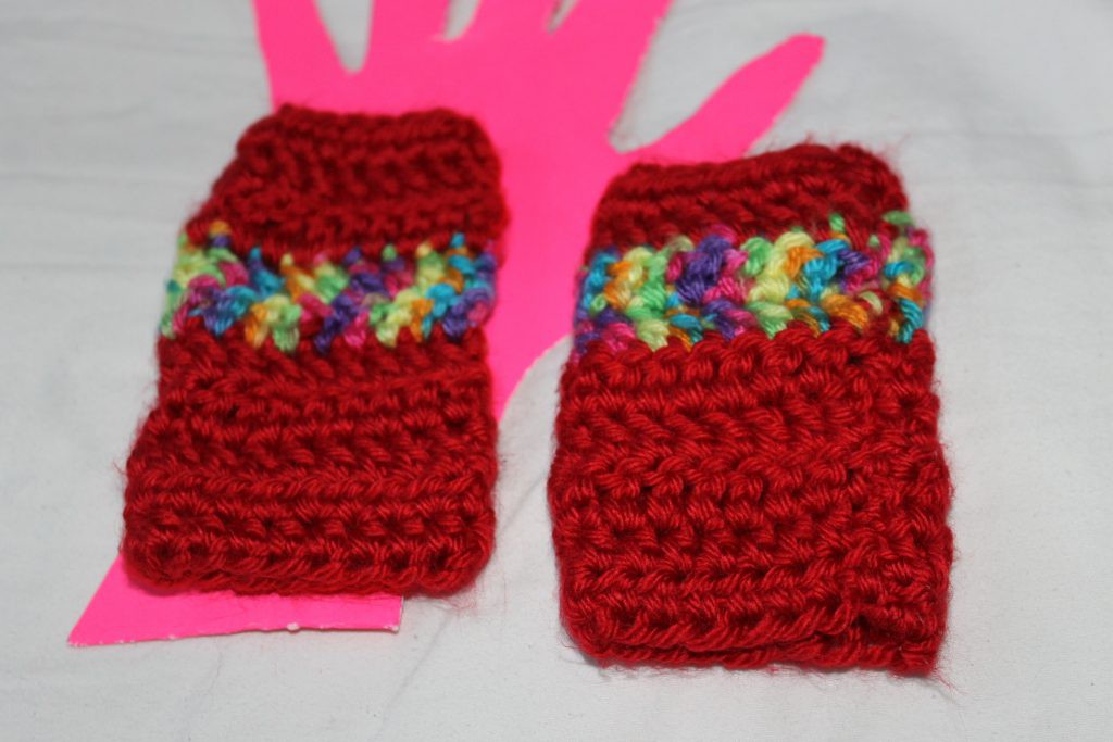 Real Red and Variegated Rainbow Bright Wrist Warmers 5×3. These hand crocheted fingerless gloves were created using Caron Simply Soft yarn in real read and variegated rainbow bright colors of yellow, teal, purple, pink and orange. They measure approximately 5 inches long by 3 inches wide. The yarn is 100% acrylic, hypoallergenic, machine washable and machine dryable.