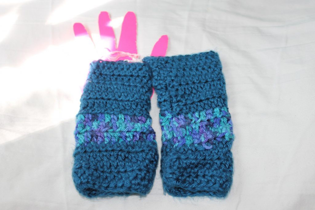 Solid Ocean and Variegated Oceana 6×3 Inch Wrist Warmers. This hand crocheted pair of fingerless gloves was created using Caron Simply soft yarn in Solid Ocean and Variegated Oceana which is teal, purple and blue. The gloves measures approximately 6 inches long by 3 inches wide.