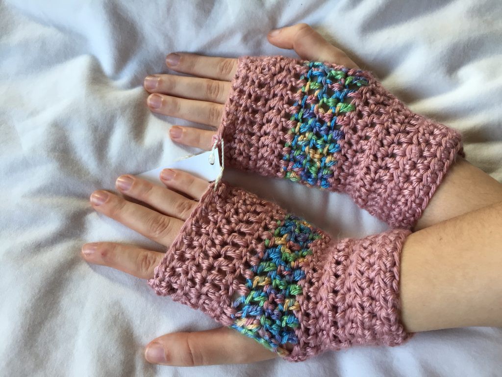 Victorian Rose and Variegated Tapestry Wrist Warmers 7×3. These hand crocheted fingerless gloves were created using Caron Simply Soft yarn in Victorian Rose and variegated tapestry colors blue, yellow and orange. They measure approximately 7 inches long by 3 inches wide. The yarn is 100% acrylic, machine washable, machine dryable and hypoallergenic.
