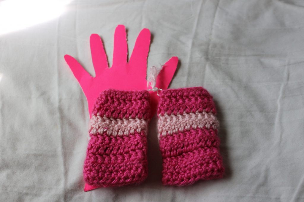 These hand crocheted fingerless gloves were created using Caron Simply Soft yarn in watermelon or dark pink and light pink. They measure approximately 5 inches long by 3 inches wide.