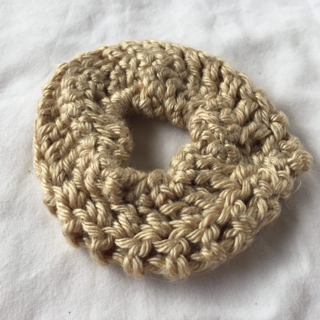 Beige Crocheted Scrunchie. This hand crocheted pony tail holder was created using Caron Simply Soft Bone colored yarn. It is 100% acrylic, hypoallergenic, machine washable and machine dryable. It has a slender piece of elastic sewn in the center. This listing is for a single pony tail holder only. It measures approximately 3-1/2 to 4 inches across with the center hole approximately 1-1/2 inches across.