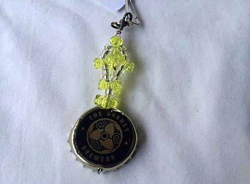 Orkney Brewery Gold Black Recycled Bottlecap and Light Yellow Tribead Keychain. This handcrafted key chain charm was created using a recycled gold and black Orkney Brewery bottle cap with a silver toned fish charm on the inside of the cap attached to clear glass beads, lemon yellow tri-beads, gun metal toned double jump ring, a copper toned lobster clasp and a silver toned metal clip on the end. All metal findings are hypoallergenic.