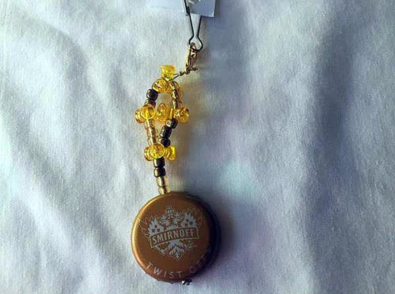 Smirnoff Yellow Silver Recycled Bottlecap and Dark Yellow Tribead Keychain. This handcrafted key chain charm was created using a recycled dark yellow and silver Smirnoff bottle cap, dark yellow tri-beads. light yellow glass beads, opaque gold glass beads attached to a gold toned lobster clasp and silver toned clip. All metals are hypoallergenic.