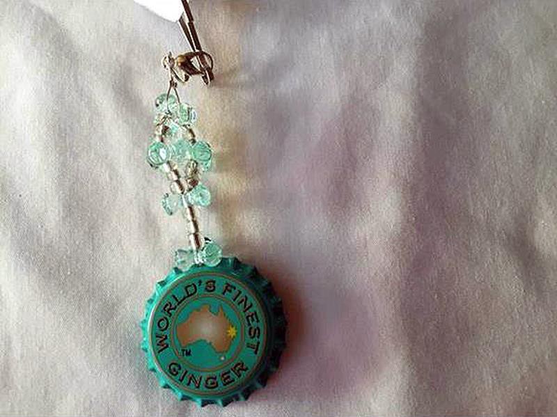 Worlds Finest Ginger Green Gold and Light Green Tribead Upcycled Bottlecap Keychain Charm. This handcrafted key chain charm was created using vintage Worlds Finest Ginger Beer bottle cap in green and gold along with clear glass beads, light green tri-beads, a picture of Rock and a Star inside the cap that is attached to silver toned lobster clasp with silver toned clip on the end. All metal findings are hypoallergenic.
